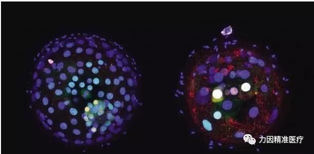 图丨研究人员用 CRISPR 技术干扰了人体胚胎中的一个蛋白质。在实验中,他们用染料标记了这种蛋白质(红色),确认它是否存在。
