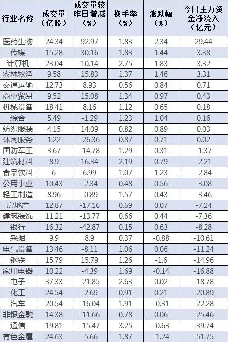 其中资金净流入金额最大的行业为医药生物,涨幅2.34%,成交量较前一个交易日变动92.97%,主力资金净流量29.44亿元。